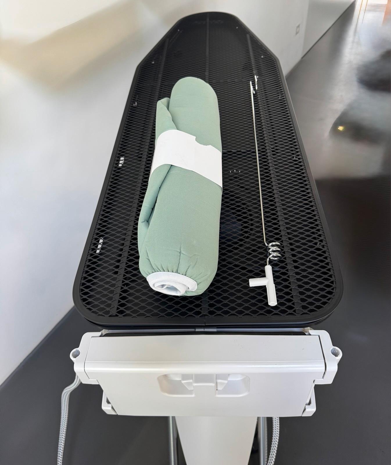 Hier sind zwei (von zwölf) Halterungen gebrochen und liegen lose in der Bügelauflage. Dies beeinträchtigt die Funktion nicht. Ansonsten neu.